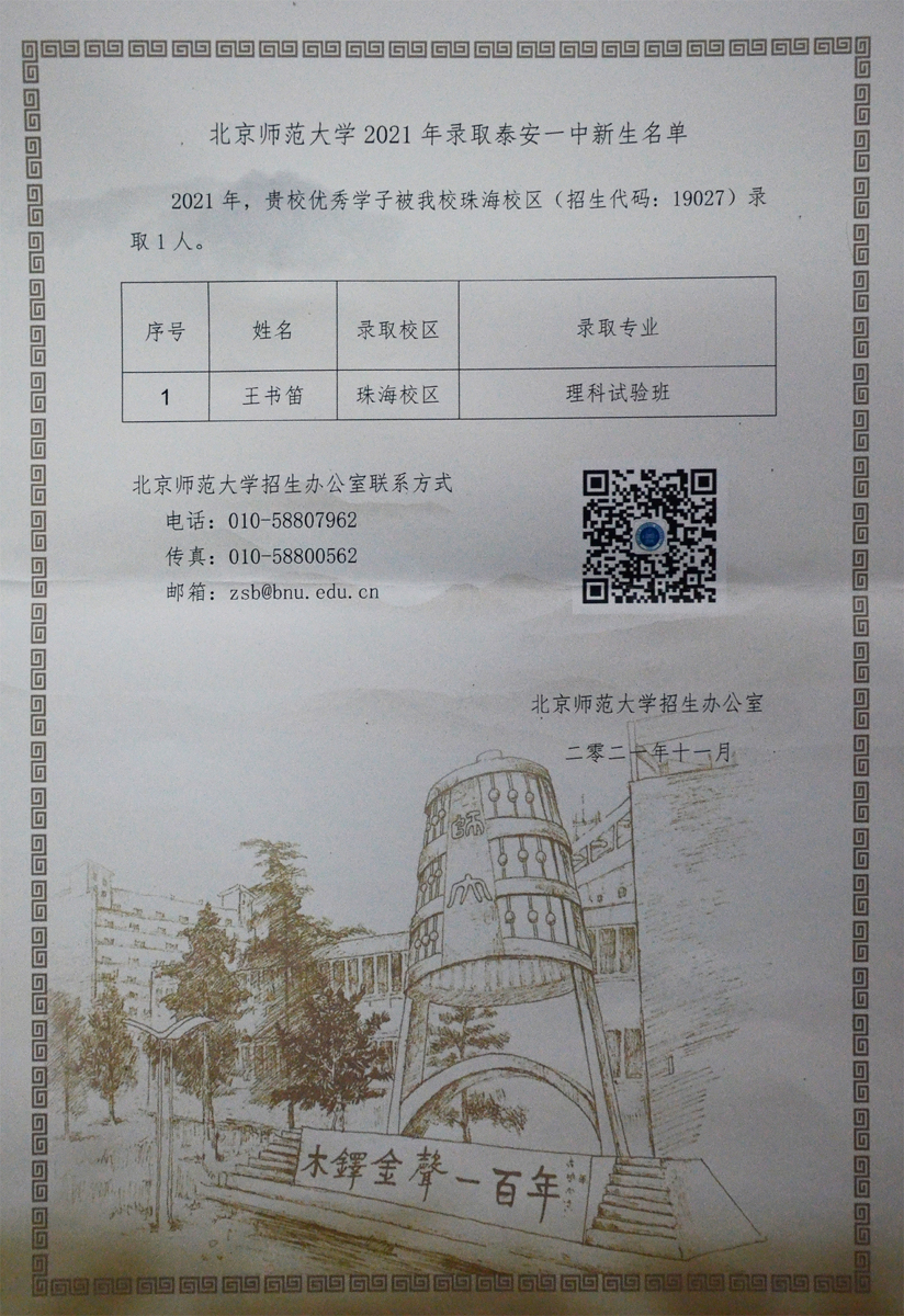 泰安一中2014级中美班学生贺逸菲获美国加州大学伯
