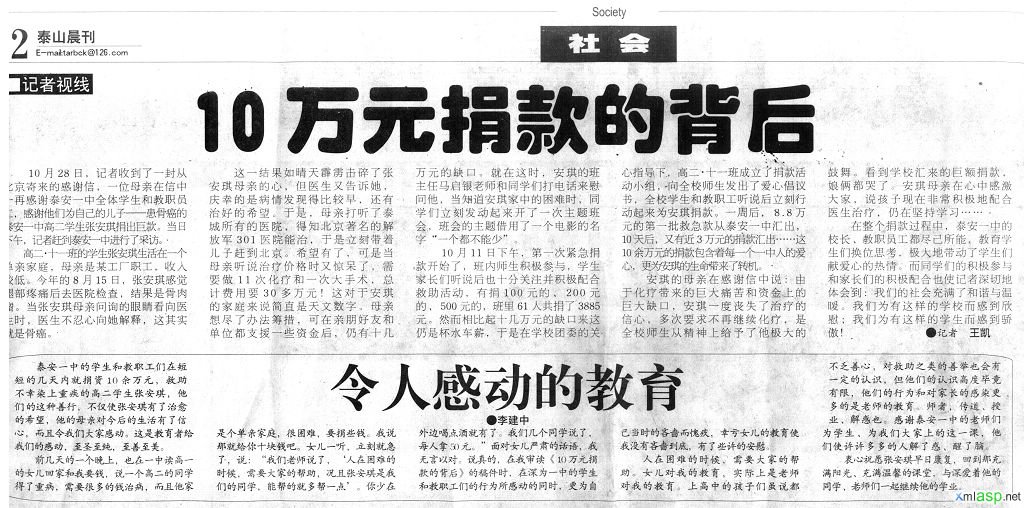 高二11班张安琪同学去年被检查出腿部患骨肉瘤急需救治,面对同学的重病与困难泰安一中的全体师生自发的伸出了援助之手,很短的时间内就捐款10余万元送到安琪的手中,使得安琪同学得到及时顺利治疗。谱写了一曲和谐互助的赞歌。