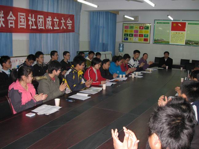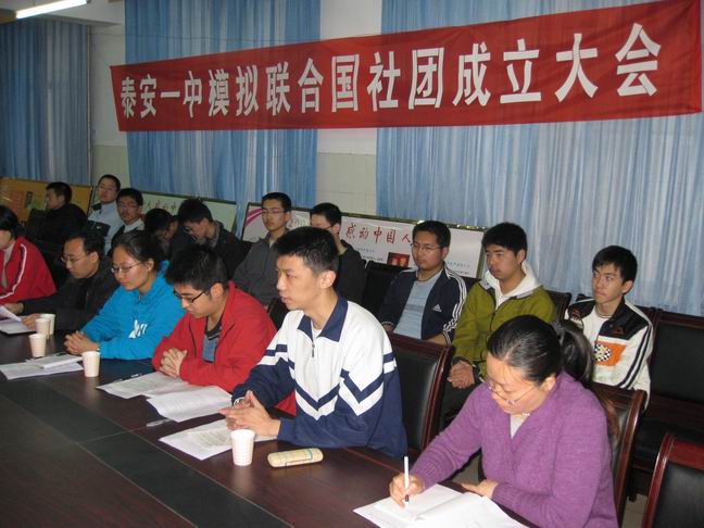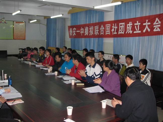2009321日,泰安一中模拟联合国学生社团在泰安一中团校召开了成立大会,会议由高一学生会主席封蔚然同学主持。模拟联合国学生社团团长代表社团成员宣读了社团宗旨、章程、活动计划。李秀笃副校长、张玉良副主任到会表示了热烈祝贺。成立仪式结束后,模拟联合国学生社团开展了第一次活动,活动的议题是“联合国千年计划之环境保护”。指导教师刘元国老师对活动作了有针对性的指导和点评。